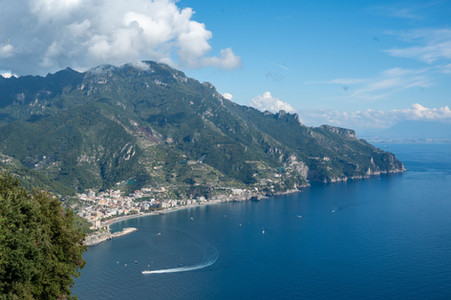 Turning uphill and slightly inland, it's a short drive to Ravello, a scenic small town set 365 meters above the Tyrrhenian sea, and home to iconic cliffside villas and gardens. The road leading here is lined with terraced gardens, many of which are planted with the region's famous lemon groves.