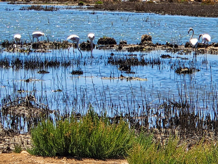 Exploring our area on the 20th we ended up at A Rocha Delicada, a beautiful estuary that fronts the Odiaxere river across from Alvor. Our friend Tony told us about an oyster farm in the area that imports the seed oysters from France, raise them in the estuary waters, and sell them to the local restaurants. We found the place but didn't appear to be open for retail at the moment so we continued to explore. farther down the road, we ran into a large flock of Storks and Flamingos feeding in the tidal waters. The Flamingos are white this time of year because they are not feeding on the shrimp that changes their color.