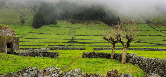 The lush green islands provide postcard perfect scenery. A patchwork of small villages and expansive pastures for grazing the islands cows, which outnumber humans by over 2:1 and provide some of the best dairy products in Portugal. The black volcanic rock provides a scenic contrast with the green pastures where it has been used for centuries to build stacked stone walls along rural roadways, dividing pastures, blocking occasional sea breezes, and providing their stored heat to animals and vegetation. Forests of mature Japanese cedars reign on the mountain tops, reminiscent of the Redwood Groves in Northern California, while roads lined with wild Hydrangeas and Azaleas meander through the hills and valleys of the island.